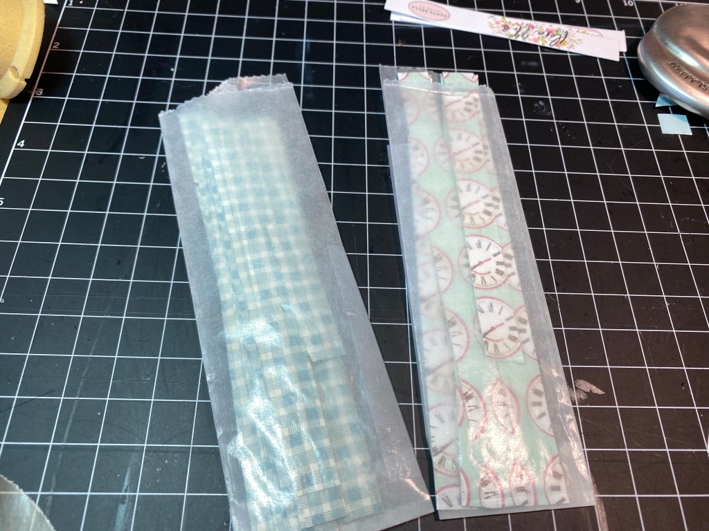 After assembling a few cards, my colored strips were in disarray. So I cut a few wax seed envelopes in half and taped the open side. Now the strips are contained but still easy to see.
