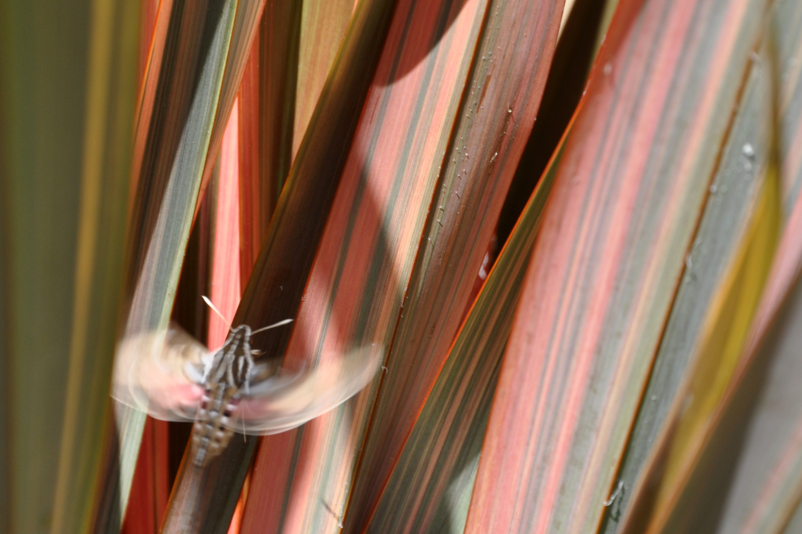 As the hummingbird flew away, the ‘moth’ settled into the clippings of my recently pruned fern.  Not wanting to lose track of the visitor, I looked over my shoulder for my camera, then walked backwards to get it.  Camera in hand I attempted multiple shots of the wings in flight.  That thing moved fast!  It zipped around the garden, plant to plant and finally disappeared behind the flax.
