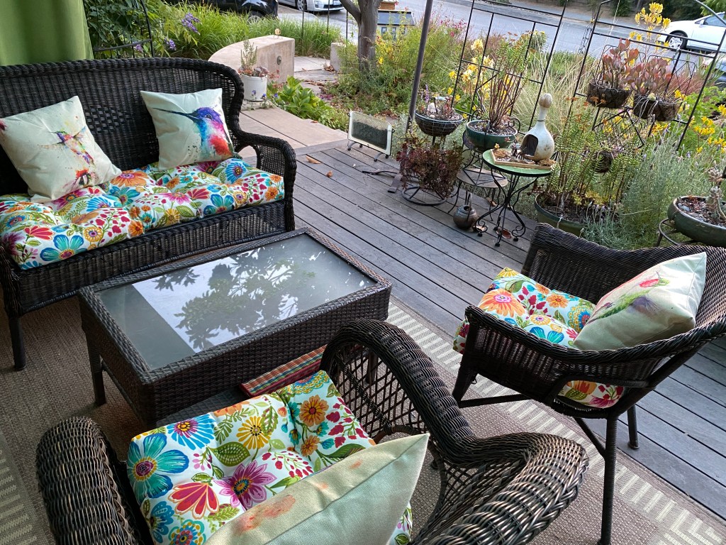 As garden chores go, I didn’t have as much to do this week. No rain means no extra weeds, except of course for the oxalis along the front garden path. I dead-headed the miniature roses and some salvia, and clipped away spent seed casings on the cornflowers. They’re looking pretty shabby but the birds love eating the seeds, so they’ll stay in the garden till they are completely spent. I used some rain barrel water to refresh the potted succulents and to rinse part of the deck.I finally found some cushions that I like for our settee and chairs online. They arrived last week. They’re twice as thick as the original cushions, so they’re really comfortable. We enjoyed spending time out there this week. The deck is also a favorite hummingbird spot, so it’s great for bird-watching as well. In addition to the two feeders, the hummers like the nectar of the kangaroo paw and the gladiolas.
