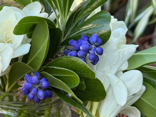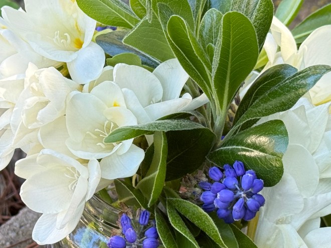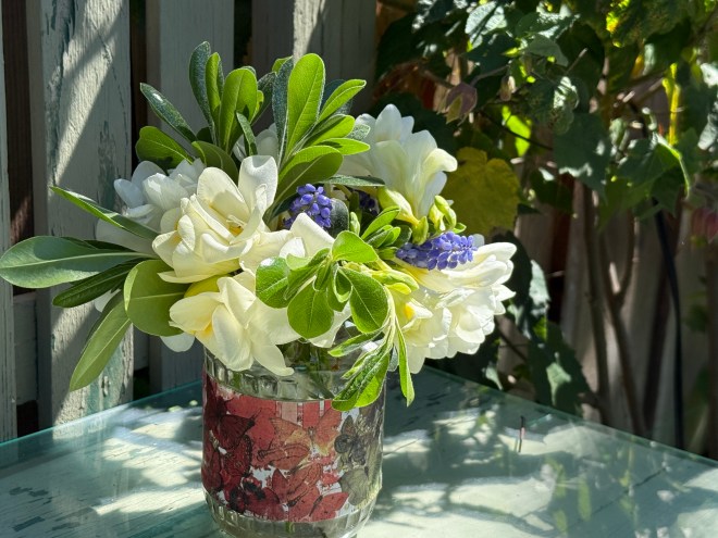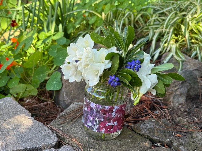 A dozen years ago, Cathy at Rambling in the Garden started a meme called “In A Vase On Monday”, or IAVOM. She wanted to challenge herself to regularly cut and arrange flowers and greens from her garden. She also challenged fellow garden bloggers, launching a wonderful garden blog meme. It’s a simple concept: cut flowers from your garden, arrange them in a jar or vase, and share them virtually with others. Gardeners post from the UK, Germany, the US, and other parts of the world. Charming, eh?