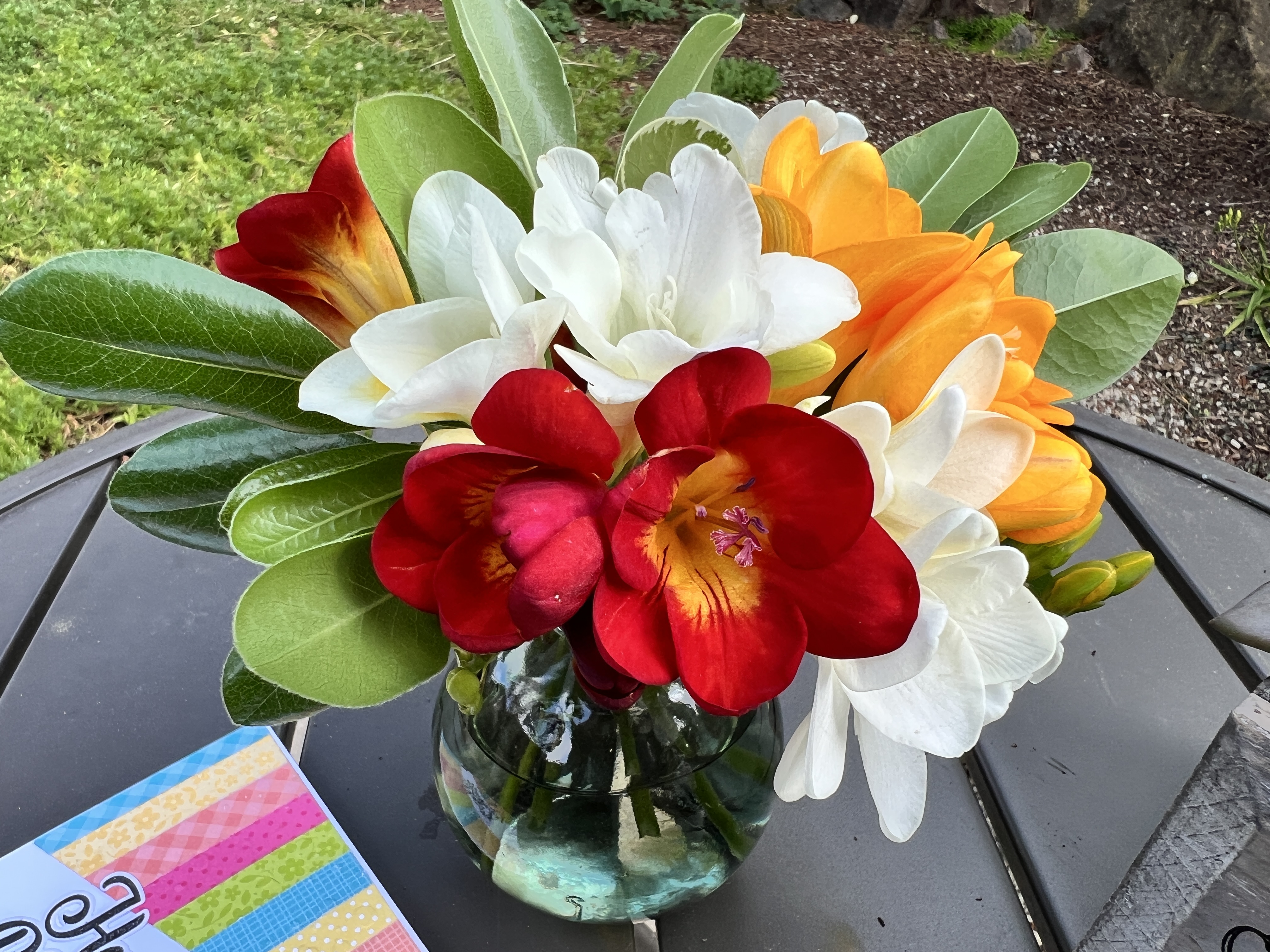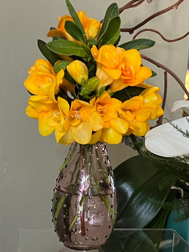 Sweet peas are slowly emerging in several shades of purple. Conversely, the freesias are winding down, but several white varieties remain in bloom. I added freesias to my vase with cuttings from our Pittosporum tree. The greens are shiny this time of year, with subtle, waxy citrus-scented flowers which generate an intoxicating scent. I hope the arrangement holds up for Easter, but if not, I’ll find more for the table’s centerpiece.