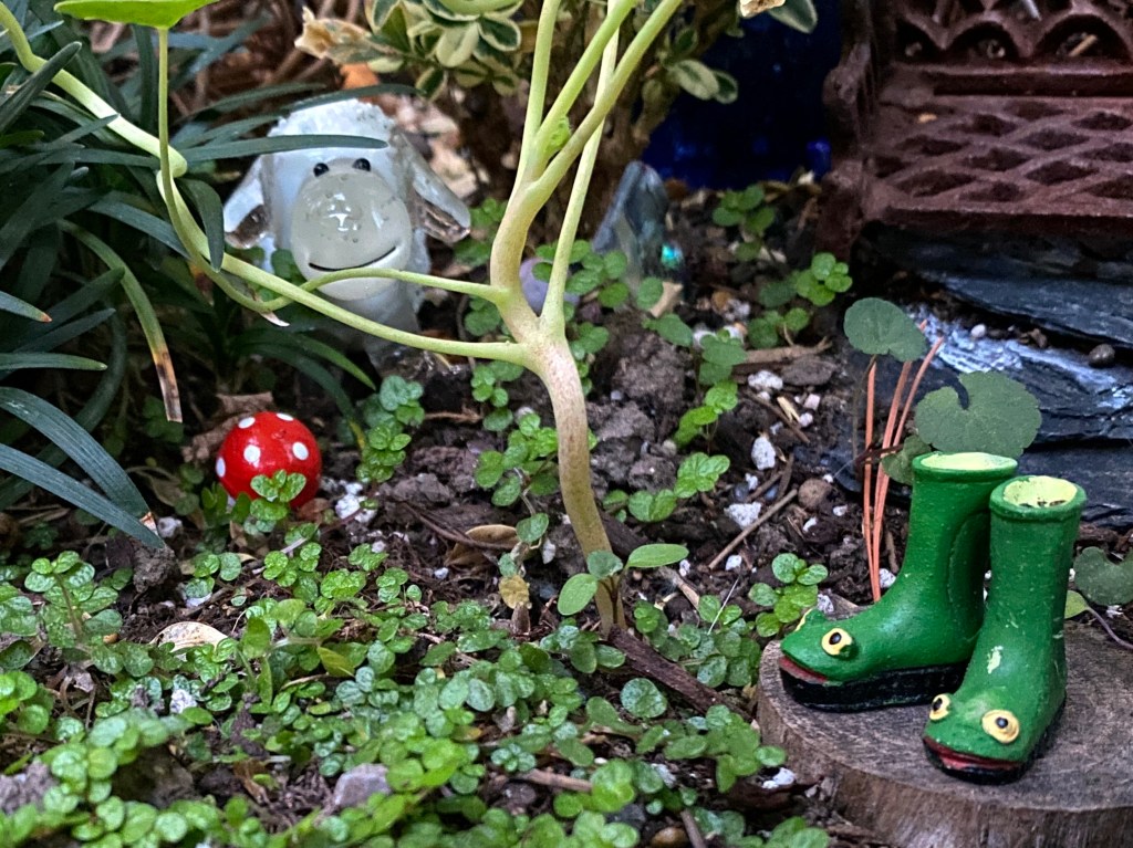 I purchased two of the miniature plants you see online from a shop called TwoGreenThumbs. It’s hard to find small-scale plants at our local nursery, and nearly impossible now with COVID. It’s nice to support a small business, and fun getting living plants in the mail. Both times I ordered, Janit tucked in a tiny gift. Check out these miniature gardening boots.