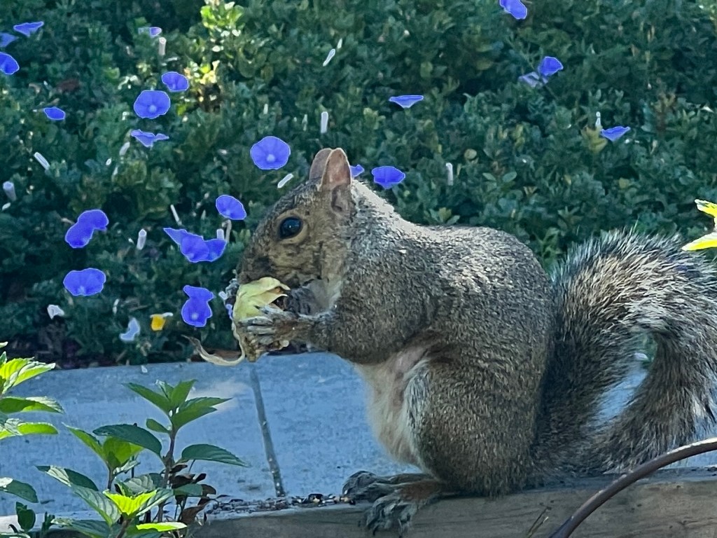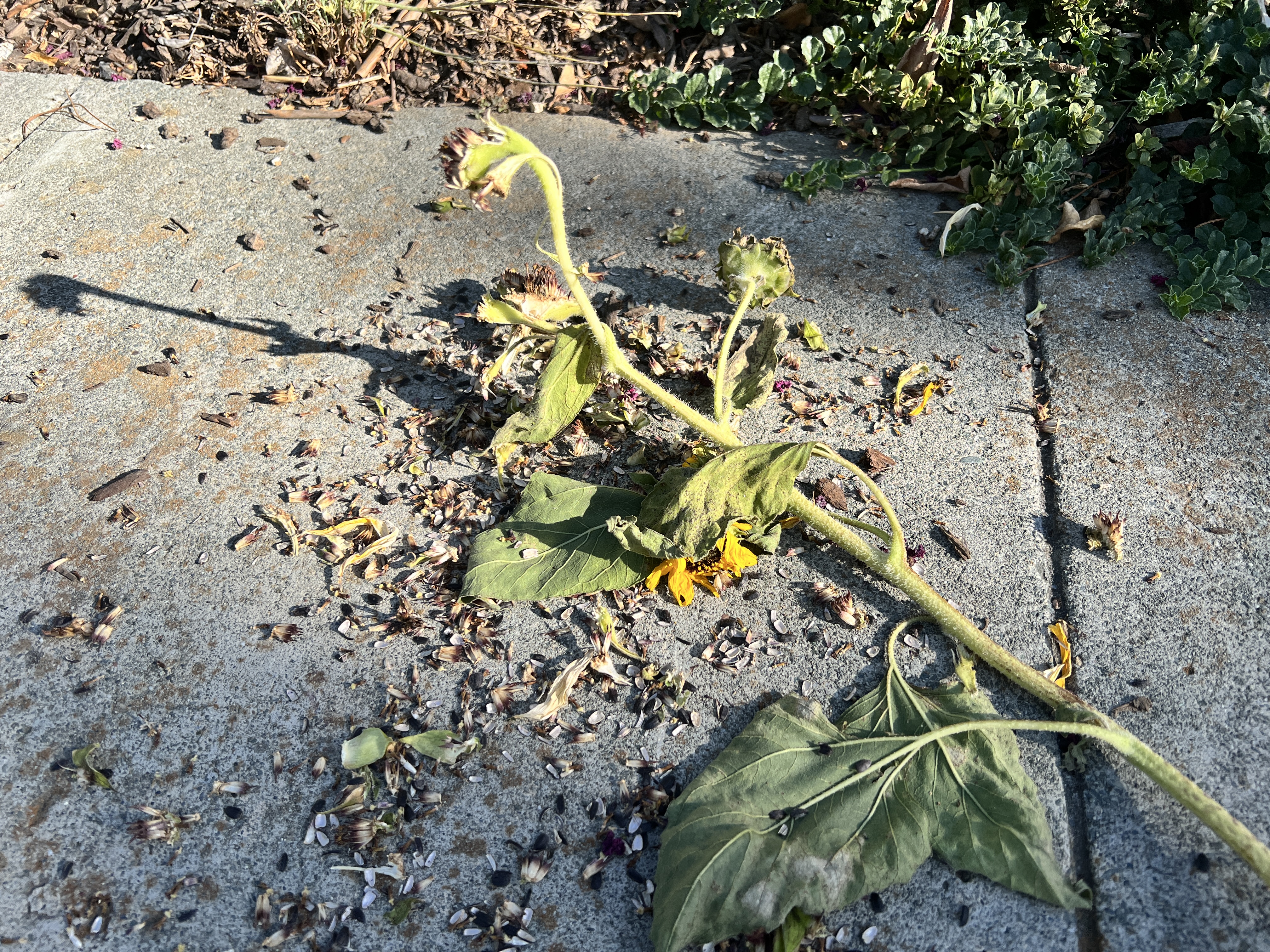 I envy the squirrel’s agility and energy as they hurl themselves from tree branch to roof, then to the back of a narrow bench or railing. This year, I’m counting on them to plant next summer’s sunflower crop. Goodness knows they’ve had their fill.
