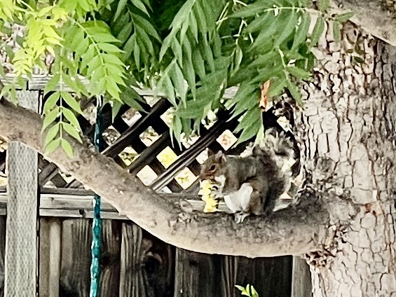 I harvested several sunflower seed heads and left them on our deck, but getting photos proved elusive. I finally captured a couple of shots last week, one of a squirrel on the sunflower stalk and later in a tree across the street with a mouthful.