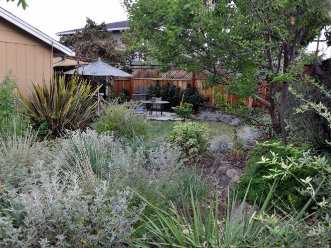 For the past seven years (yes years) I’ve been doing battle with thrips. Until last week, Viburnum Tinus filled the space between our home office window and the walkway to our deck. When healthy, it’s quite lovely. You can see the plants looking their best here. Shiny, dense green leaves give way to flowers and dark purple berries. It provided cover for the lizards and made a nice green hedge under the window.