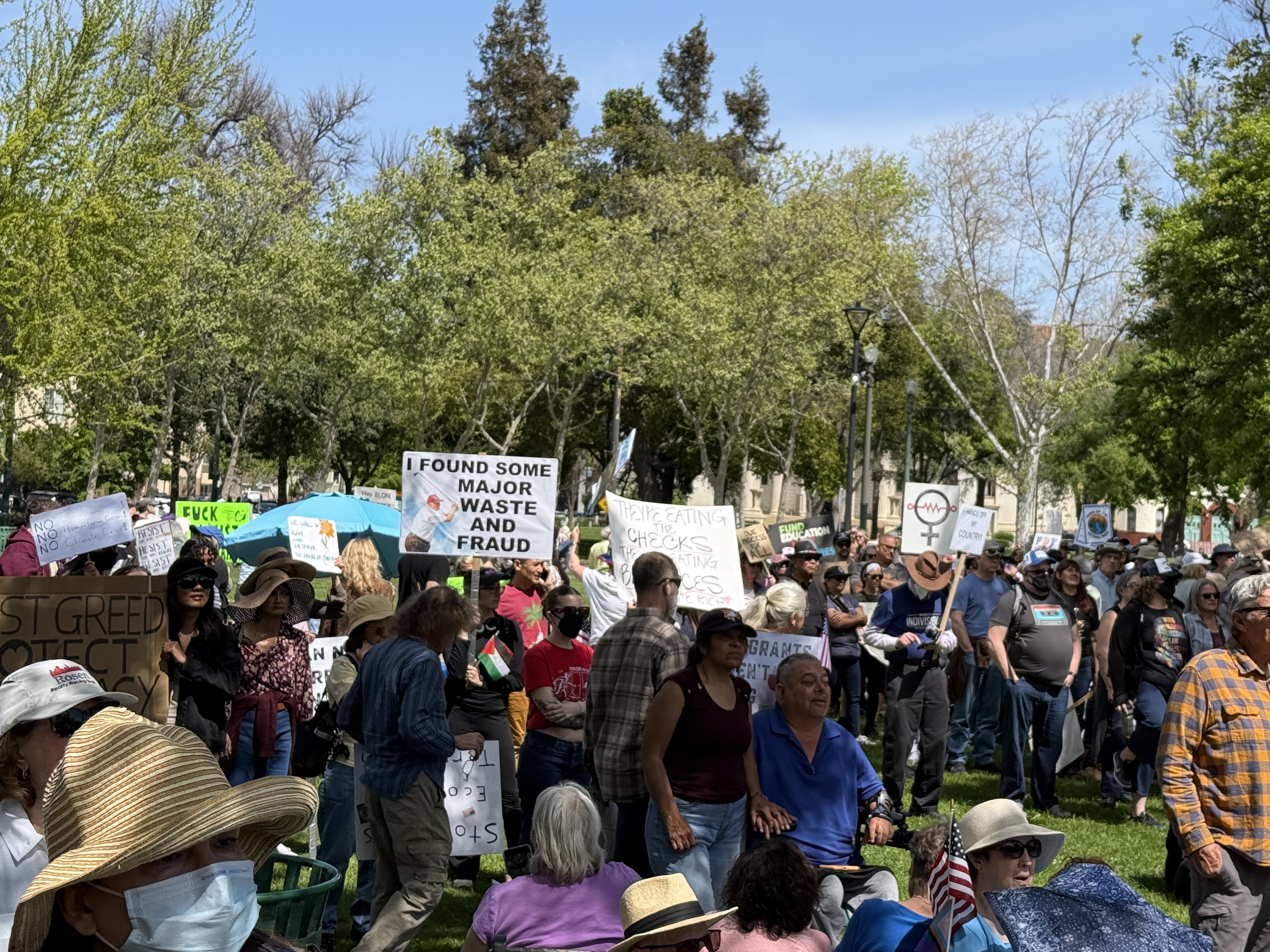 I drove from Los Gatos to a shopping center in San Jose, rendezvoused with Mike, and took the light rail to the downtown San Jose event together. Over 5,000 protestors attended the San Jose rally.