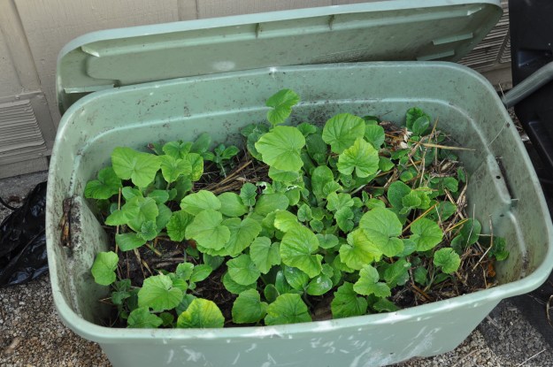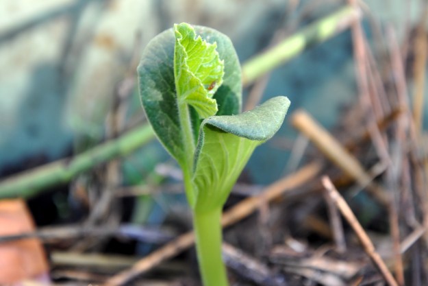 When my nifty, thrifty, spinning composter reached capacity, I searched for alternatives. I re-purposed an old Rubbermaid bin, once used for children’s toys. I tossed in the straw left over from our Halloween party, then dry leaves, grass clippings and kitchen waste. I popped on the lid, drilled holes in the bottom for air circulation and drainage, and called it a day. Turning the compost was the biggest challenge. It was hard to get leverage in a narrow, small bin but I managed. About a month ago, I removed the lid and saw this: tiny pumpkin sprouts. Awe-some!!!