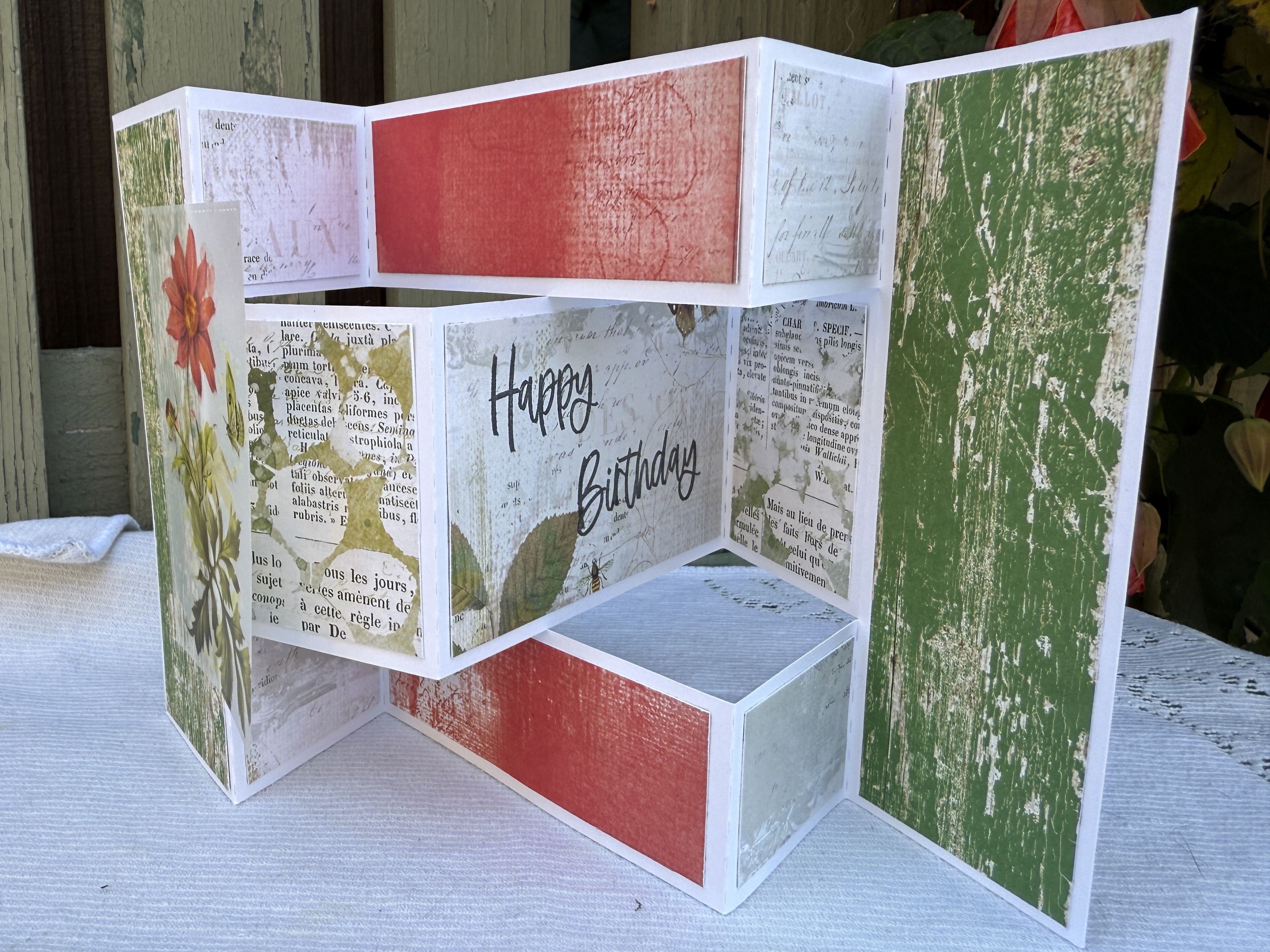 I’ve managed one card this month using a tried-and-true pattern known as a tri-fold card. Sharon and I learned how to make this card many years ago at a Saturday crafting retreat. It works well with scraps, with the challenge of using disparate colors and textures to create a whole.