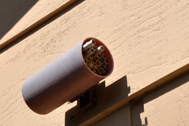 I heard a squirrel overhead, and noticed activity in the little mason bee nesting house. What a day!