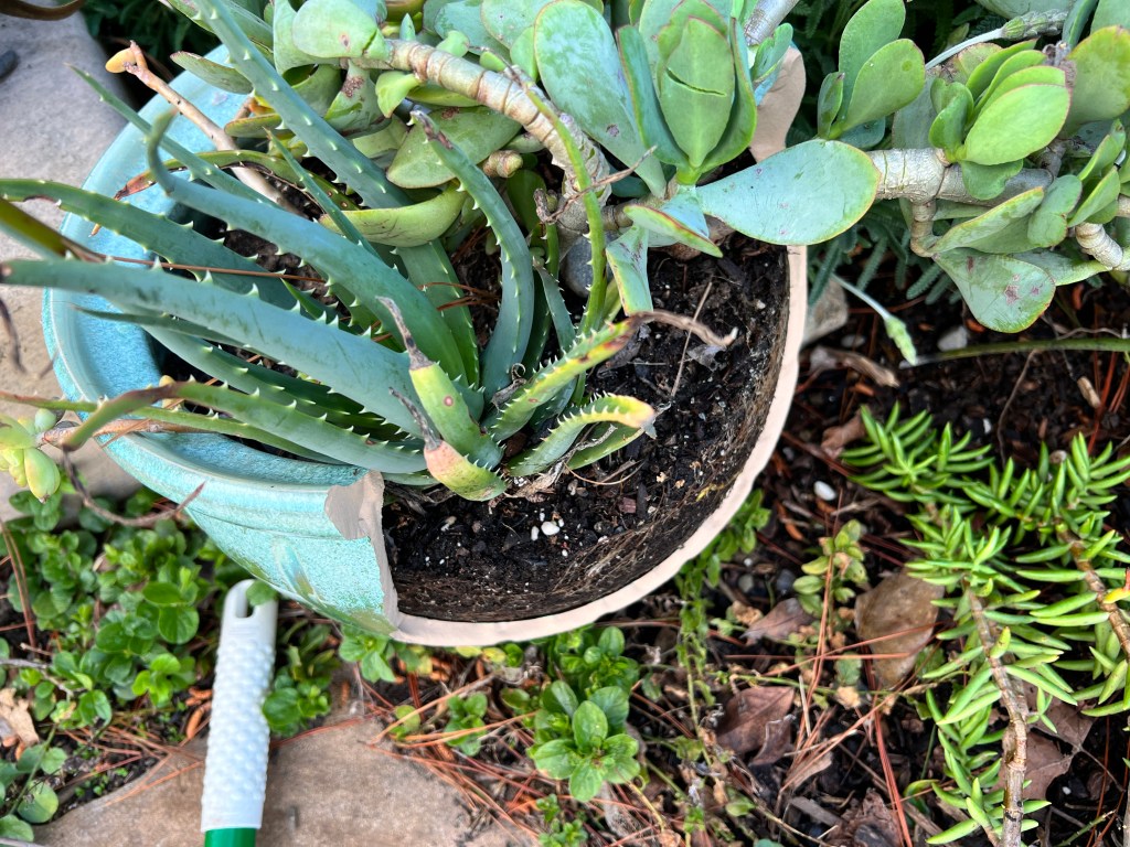 Yesterday, I looked under the veg trug, now home to a collection of well-established succulents, and spotted a just-out-of-reach oxalis, an invasive plant considered a weed in this area. My inner monologue cautioned against it, as I would have to kneel on the gravel path, bend at the waist, twist my neck, and then reach back to grab the weed. If you know anything about oxalis, you’ll know that the roots are strong and rarely willing to part company with the earth. I could have retreated and found my kneeler and a garden fork, but impatience got the better of me, and I went for it. Success! The weed is gone, I returned to an upright position, and I’m none the worse for wear. It’s the little things.