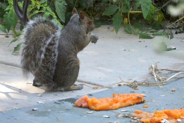 I happened upon a squirrel at the top of the eight-foot stalk, and then I ran inside to get my camera phone. I tiptoed down the path and tried to hide behind a tree, but the squirrel was on to me. I got a couple of snaps as the squirrel climbed down.