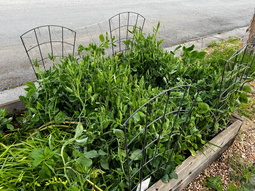 By March, the sweet peas took off, quickly surrounding the lower half of the remaining sunflower stalks, so I left them in place to dry. The thick stems of the sunflowers made excellent stakes for the climbing sweet peas.